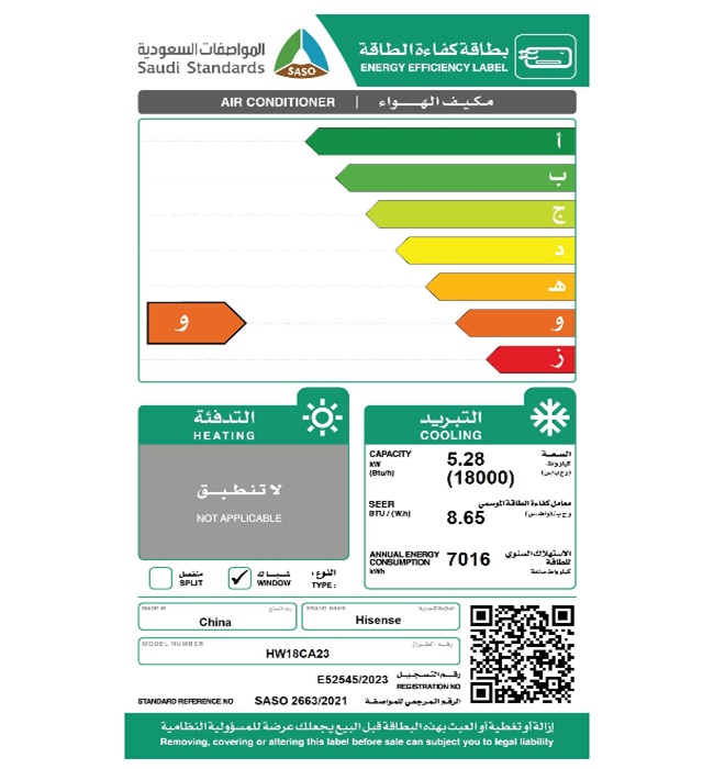 - وحدة التبريد: 18000 وحدة (1.5 طن)